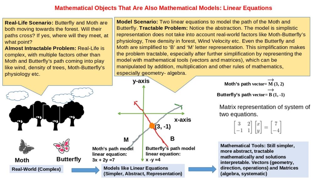 In essence, linear equations model reality by describing how things relate to each other, while vectors and matrices represent these equations as tools that facilitate their study, manipulation, and application in solving real-world problems. This duality highlights the complementary nature of mathematical abstraction and computational practice in linear algebra. The term “mathematical object” refers to any entity within mathematics that has distinct properties, can be defined or described using mathematical language, and often plays a role in mathematical reasoning, proofs, or constructions. Mathematical objects are abstract entities that exist independently of physical reality but are central to the study of mathematics.