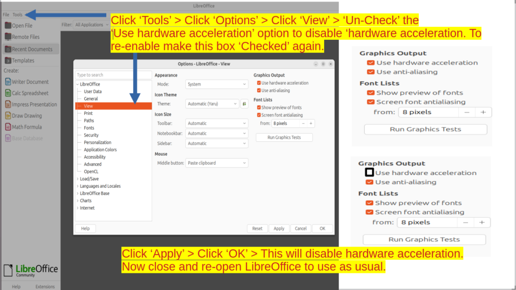 - If you’re experiencing crashes with LibreOffice after extended use on your Linux system, consider exploring whether disabling ‘hardware acceleration’ resolves the issue. Hardware acceleration may enhance performance but could also introduce instability if not properly supported by your graphics drivers or windowing systems. How to disable ‘hardware acceleration’? Open Libre Office > click ‘Tool’ > click ‘Options’ > click ‘View’ > uncheck the ‘Use hardware acceleration’ under ‘Graphics Output’ > Click ‘Apply’ and ‘OK’ to save the settings > close and reopen Libre Office, now it will run WITHOUT ‘hardware acceleration’.