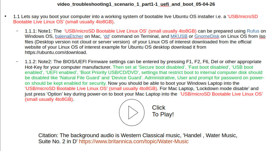 -1.1.1: Note1: The ‘USB/microSD Bootable Live Linux OS’ (small usually 4to8GB) can be prepared using Rufus on Windows OS, balenaEtcher on Mac, ‘dd’ command on Terminal, and MKUSB or GnomeDisk on Linux OS from iso files (Desktop version not cloud or server version) of your Linux OS of interest downloaded from the official website of your Linux OS of interest example for Ubuntu OS desktop download it from https://ubuntu.com/download.