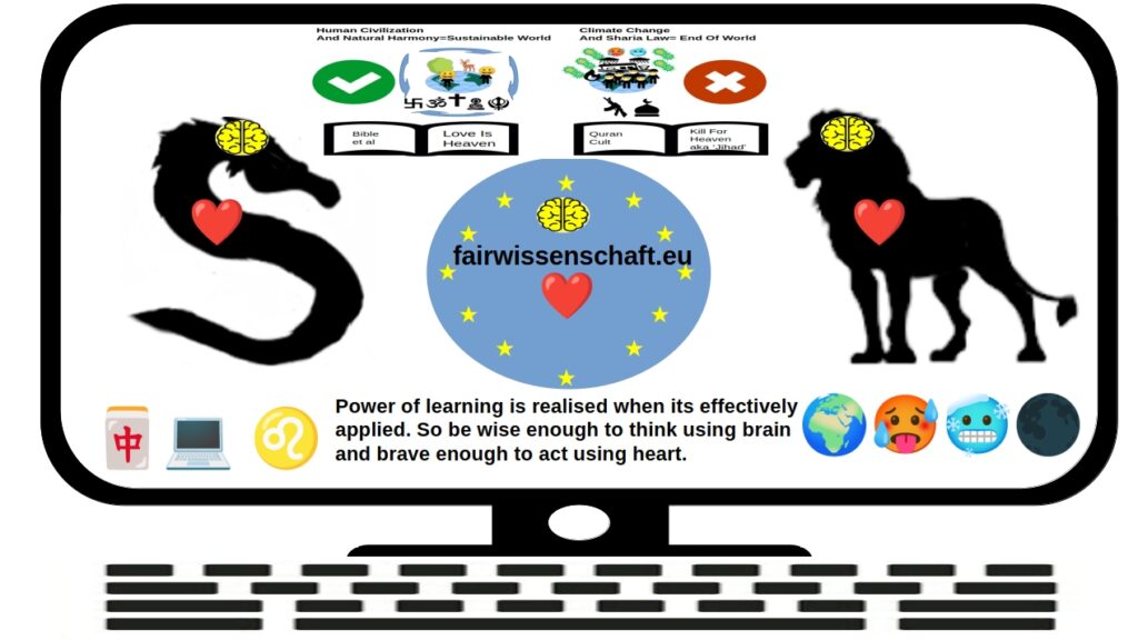 As a learning tool, computers provide instant access to a wealth of knowledge, ranging from academic resources and textbooks to multimedia content and online courses. This virtually boundless source of information allows learners to explore new subjects. Computers enable learners to interact with and engage with content in innovative ways, enhancing the learning experience and facilitating deeper understanding. From programming and software development to data analysis and artificial intelligence, computers facilitate the translation of knowledge into tangible outcomes, driving innovation and progress. Thus computers represent, both the learning and application of knowledge effectively. The laptop emoji,💻 depicts an open laptop computer with a keyboard, trackpad, and screen, under the name “Personal Computer”. When selecting a symbol for the product, I also wanted something signifies the strength and power that come with its knowledge, rather applied knowledge. The lion, with its regal and fearsome image, embodies these qualities. Lions are often associated with courage, leadership, and dominance, making them a fitting choice to symbolize the brand. As much of the computational technology used for this fairwissenschaft.eu is EU (European Union) based or open source with significant EU contribution, the computer can also be taken to represent EU. The ♌ Leo emoticon is a symbol of the Leo constellation, which is one of the 12 zodiac constellations. The constellation Leo is represented by the lion and is associated with the Sun’s position during Leo’s astrological period, which is generally considered to be from approximately July 23 to August 22. The lion is often associated with the United Kingdom, as it is the national animal of England and features prominently in the national flag and coat of arms. The lion has been a symbol of England since at least the 12th century, when Richard the Lionheart ruled as King. The lion is sometime presented on the national flag of the United Kingdom, known as the Union Jack, which combines the crosses of Saint George (England), Saint Patrick (Ireland), and Saint Andrew (Scotland); while the flag of Wales, includes a Dragon, symbolising strength, courage, and resilience and its origin can be traced back to ancient Celtics mythology (King Vortigern) and later also used by Tudor dynasty (Henry VII, first Tudor king of England with Welsh ancestry). Interestingly, Dragon is also highly regarded in East Asia (China, Taiwan, Japan, South Korea, Singapore), where in addition to strength, it represents wisdom and good luck. The Dragon is shown in the logo of fairwissenschaft using the (chinese game) Mahjong red dragon emoji 🀄, symbolising not only strength, courage, resilience from Wales Dragon, but also strength, wisdom and good luck from East Asia Dragon. Now, as this website domain name indicates (fairwissenschaft.eu) its an EU domain website, so at the center of the dragon, dragon-heart and dragon-brain and the lion, lion-heart and lion-brain there is the EU symbol of 12 stars, which is a symbol of completion, perfection and harmony, all put at the center of a computer screen because the technology used for this website is predominantly EU based or open source with significant EU contribution. In other words, the EU 12 stars adds harmony and perfection to the duo of dragon and lion, en route to completion in perfection and harmony as a trio of dragon, star and lion. The European Union flag is a symbol of unity and harmony, featuring a blue background with 12 golden stars arranged in a circle at its center. The design was originally created by the Council of Europe in 1955, and it was later adopted by the European Communities in 1985, which eventually became the European Union. The number 12, representing the stars in the circle, signifies completeness and harmony among the European nations. This symbolism is further reinforced by the fact that there are 12 Apostles of Jesus Christ, symbolizing completeness in faith and religion. The number 12 also holds significant cultural and historical weight, appearing in various traditions and contexts, such as the 12 months of the year, 12 hours on a clock (12 hour measure was developed by ancient Egyptians and improvised further by Romans who added measure of minute for improved accuracy), and the 12 Ornaments, a group of ancient Chinese symbols representing authority and power. Thus, the number 12 in the European Union flag signifies not just completeness but also a rich tapestry of cultural and historical symbolism. The heart indicates bravery and courage to act, while the brain indicates knowledge and wisdom precedes action. As this website embraces an eco-friendly theme, its logo reflects the detrimental impacts of human overpopulation and activities such as deforestation and pollution on the environment. It highlights the consequences of climate change, including extreme weather events, the loss of diverse animal and plant species, and the potential for widespread extinction. The logo symbolizes the grave threat to the planet, where rising sea levels from melting ice could ultimately submerge landmasses, leading to the loss of all life as we know it. Taken together, the symbol of the product is leo or lion and a dragon with a computer, followed by a gentle reminder about the consequences of human induced climate change, which will eventually come back to bite us in form of extremes of climate, loss of flora fauna natural habitat, loss of balance of nature, destruction of planet earth and in turn cause famines, diseases and potential extinction of humans, call it ‘what goes around comes around’, Newton’s law of action-reaction or law of karma, in anycase its also completion of a full circle #fairwissenschaft 🀄💻♌fairwissenschaft🌍🥵🥶🌑.